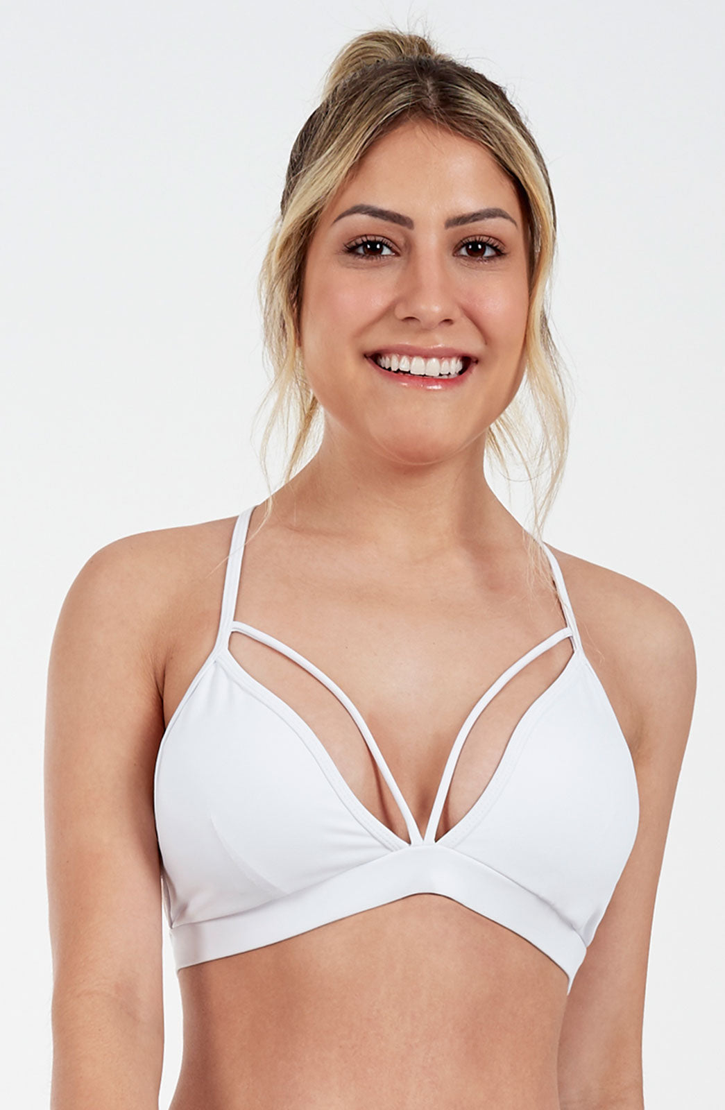 Model Front: Alto Giro Fitness Haut Top Up Co2 Rolete Frente E Costas Branco